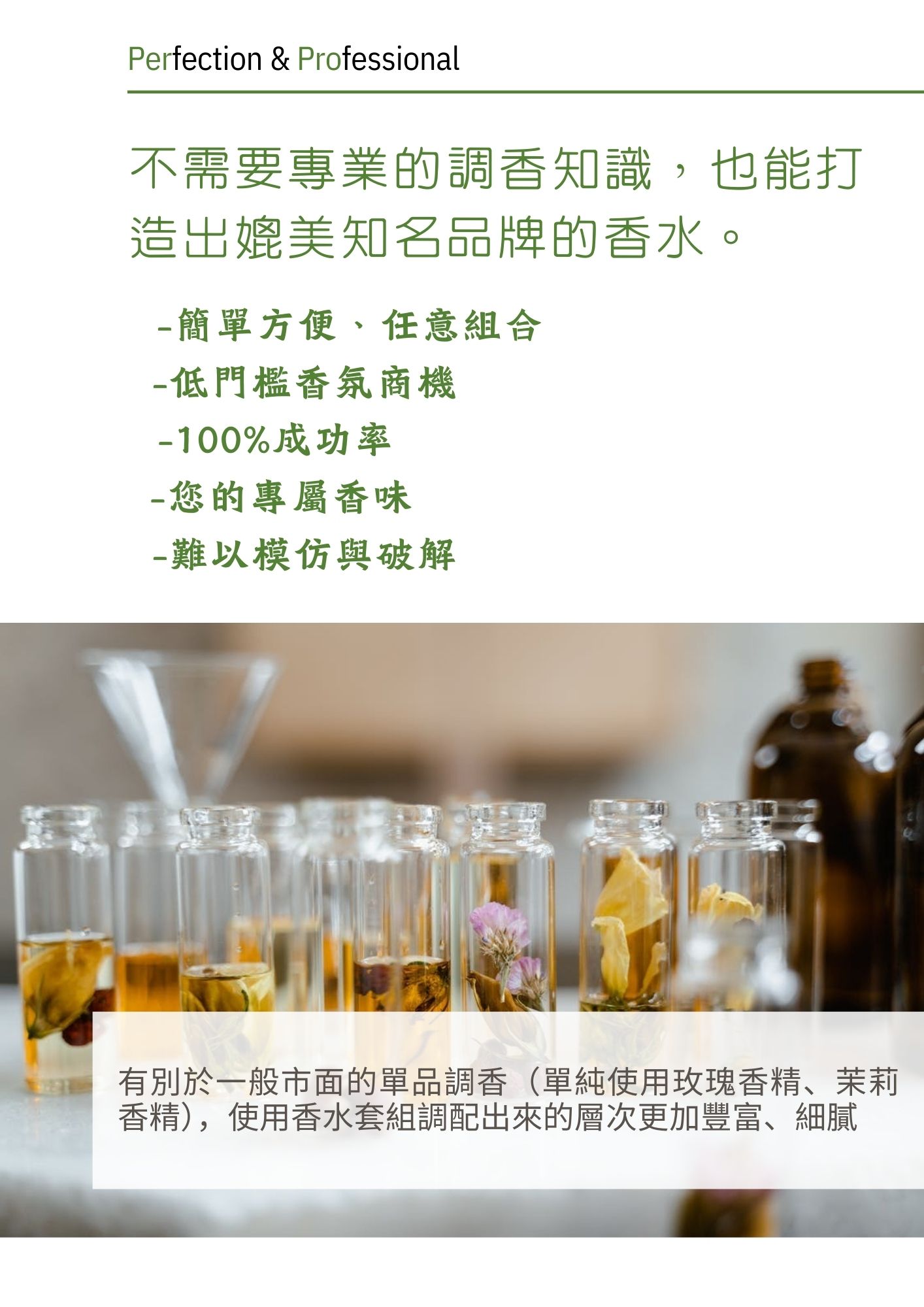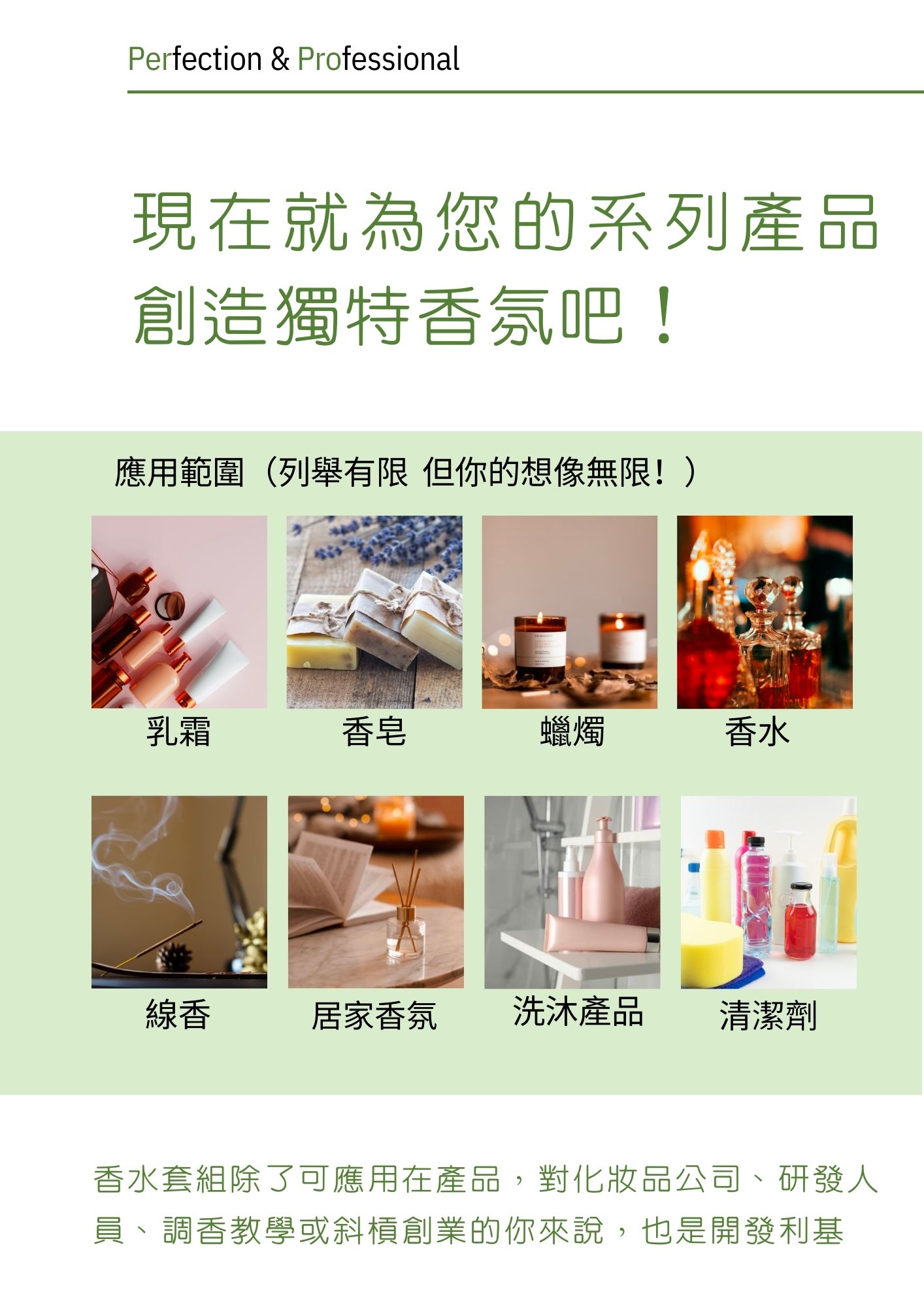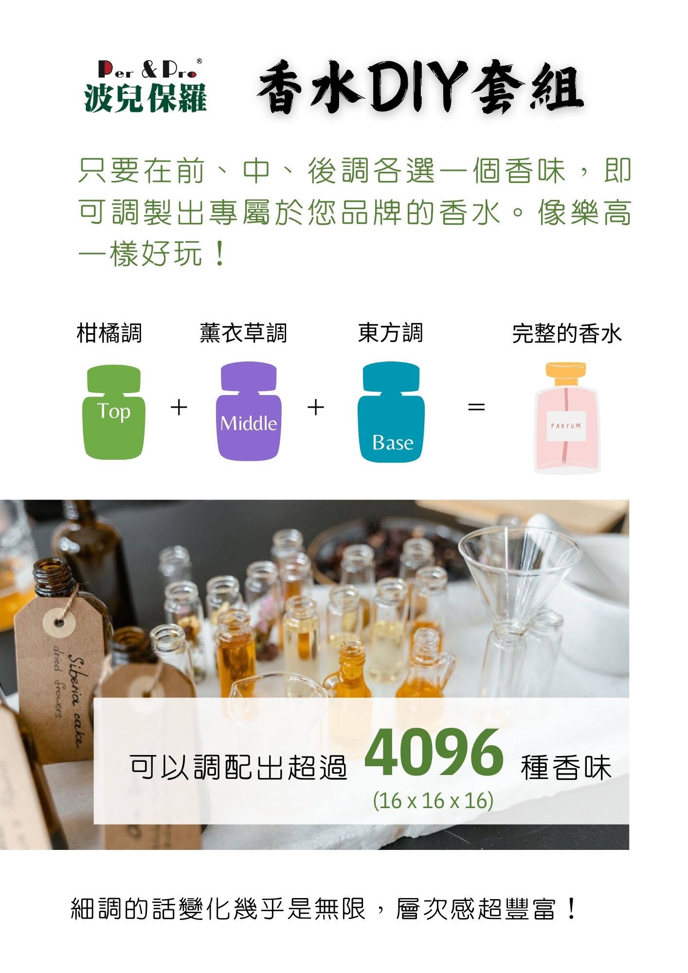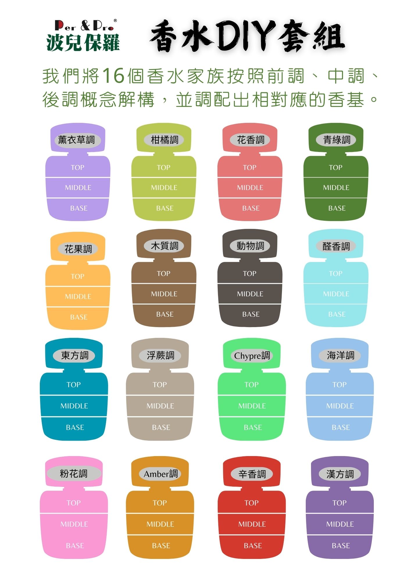 川山/波兒保羅【獨家】100%成功率香水DIY套組不需要專業的調香知識,也能打造屬於您品牌的香水 你在開發保養品、蠟燭、香皂或是擴香嗎?你不想跟市面味道撞香嗎?川山/波兒保羅提案一個快速又低成本的方式來做產品的香味開發 使用方式 最近10年來,我們公司一直收到客戶想要客製化調香的要求。原來,很多人嘗試自己調香後才發現,調香其實是一門很深的學問,並不是只有把幾種精油、香精混在一起就可以稱之為香水,還要考慮整體香味的結構性、延續性、保留性,也大大增加了學習的門檻。因此,川山/波兒保羅開發了獨家的「100%成功率香水DIY套組」,史無前例地將香水解構,將香水的16種香調拆解成前調Top Note、中調Middle Note、後調Base Note,你只要在前、中、後調各選擇一個香味,就可以很快地建構一個完整的香水基本架構,更可以再根據你的需求去做香水主題、個性的變化。即使沒有任何調香知識也可做出專屬於你品牌的香味!除了15個典型香調之外,更有波兒保羅為漢民族創作的專屬獨家香調—漢方調! 特點 操作簡單方便隨你任意組合您的專屬香味難以破解與模仿100%成功率 可產生 種變化 0 (16×16×16) 還會怕找不到中意的? 誰適合100%成功率香水DIY套組? 1. 化妝品公司、香水品牌加速研發「100%成功率香水DIY套組」可以做為快速又低成本的產品香味研發方法。想賦予產品什麼意象,或想呈現給消費者什麼感覺,即可隨時從眾多香水組合中挑選出對應的香味,例如:想推出春天主題香水,就可以用柑橘Top Note+水果花香Middle Note+木質香 Base Note來做搭配。2. 飯店、連鎖店開發獨特風格或形塑公司形象3. 香氛課程老師、香水DIY店家❀ 有別於一般的單品調香(單純使用玫瑰香精、茉莉香精),使用「100%成功率香水DIY套組」調配出來的香味層次更加豐富。❀ 調出的香味可以比肩市面上名牌香水,可以讓學生做出的成品更有質感。❀ 可以讓學生自由挑選香味組合,選擇更加多元,也可以視課程的主題挑選出適合的香味來做搭配。4. 研發人員或學生強化調香能力「100%成功率香水DIY套組」提供完整香水香型延伸性的認識,作為教科書收藏 網路下單「100%成功率香水DIY套組」 香調指南 Perfume notes 薰衣草香調Lavender Note 芸香調Citrus Note 花香調Floral Note 水果花香調Fruity Floral Note 木質香調Woody Note 動物香調Animalic Note 粉花調Powdery Floral Note 醛香調Aldehydic Note 東方調Oriental Note 青綠調Green Note 浮蕨調Fougere Note Amber調Amber Note Chypre調Chypre Note 海洋調Ocean Note 辛香調Spicy Note 漢方調Ba-Shu Note Facebook Youtube Instagram Link ❀ 追蹤我們Facebook、Instagram、YouTube,獲取更多香知香識 ❀